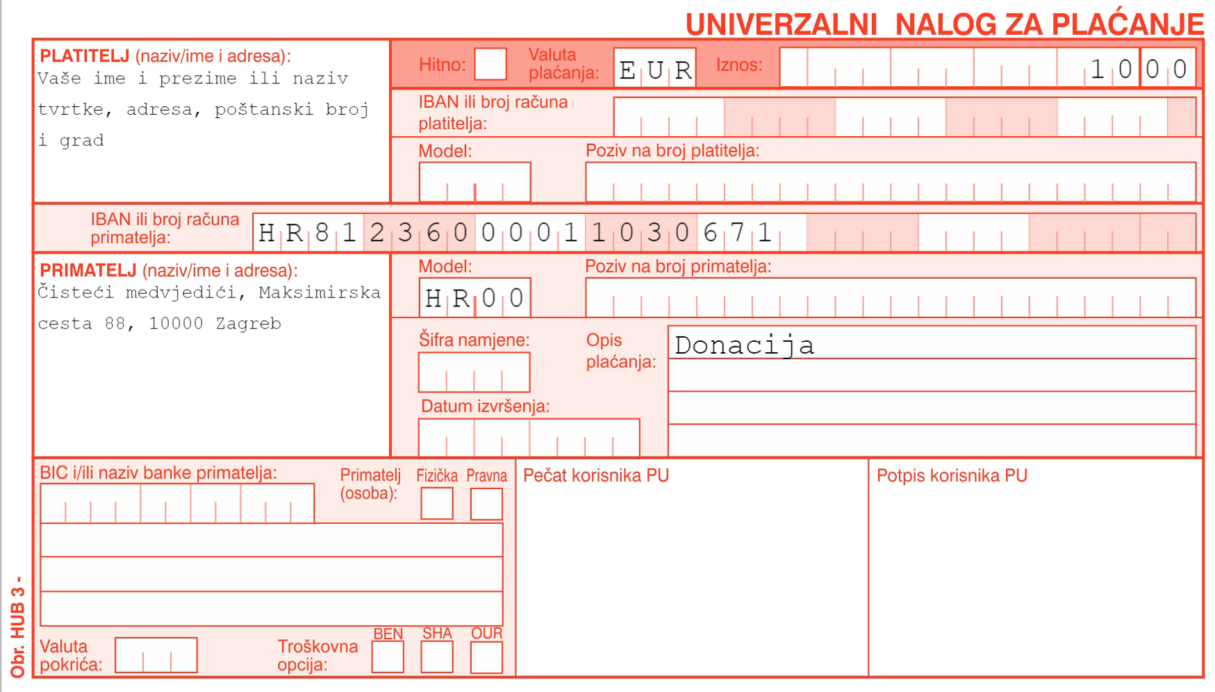 Iznos: Upisuješ iznos željene donacije u eurima (npr. 10,00)